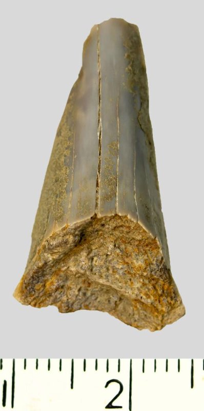 Зуб (фрагмент). Акула. Cretoxyrhina denticulata (Glickman, 1957). Классификация: Хордовые Chordata, Позвоночные Vertebrata, Хрящевые рыбы Chondrichthyes, Пластиножаберные Elasmobranchii, Акулы Selachii, Ламнообразные Lamniformes, Cretoxyrhinidae