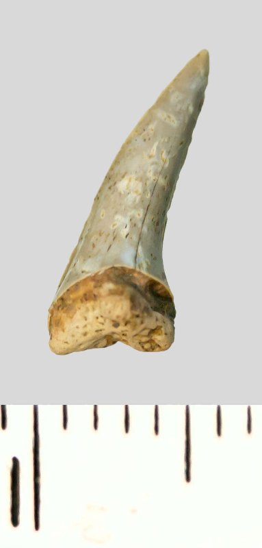 Зуб (фрагмент). Акула. Lamniformes gen. indet. Классификация: Хордовые Chordata, Позвоночные Vertebrata, Хрящевые рыбы Chondrichthyes, Пластиножаберные Elasmobranchii, Акулы Selachii, Ламнообразные Lamniformes