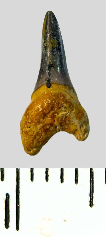 Зуб. Акула. Archaeolamna cf. kopingensis (Davis, 1890). Классификация: Хордовые Chordata, Позвоночные Vertebrata, Хрящевые рыбы Chondrichthyes, Пластиножаберные Elasmobranchii, Акулы Selachii, Ламнообразные Lamniformes, Cretoxyrhinidae