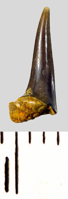 Зуб. Акула. Eostriatolamia subulata (Agassiz, 1843). Классификация: Хордовые Chordata, Позвоночные Vertebrata, Хрящевые рыбы Chondrichthyes, Пластиножаберные Elasmobranchii, Акулы Selachii, Ламнообразные Lamniformes, Песчаные акулы Odontaspididae