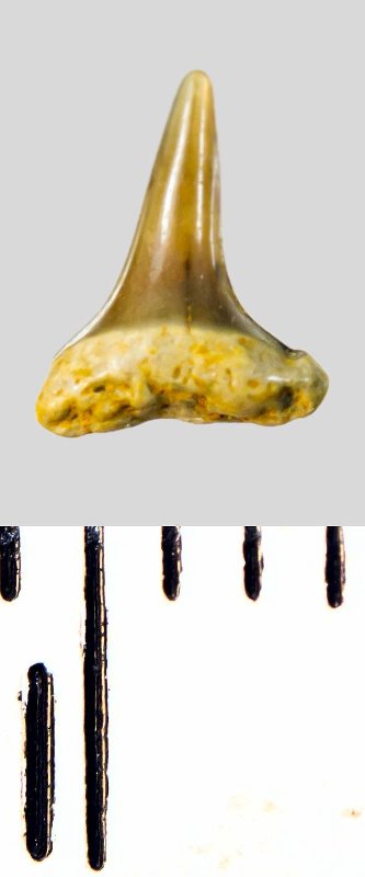 Зуб. Акула. Eostriatolamia subulata (Agassiz, 1843). Классификация: Хордовые Chordata, Позвоночные Vertebrata, Хрящевые рыбы Chondrichthyes, Пластиножаберные Elasmobranchii, Акулы Selachii, Ламнообразные Lamniformes, Песчаные акулы Odontaspididae
