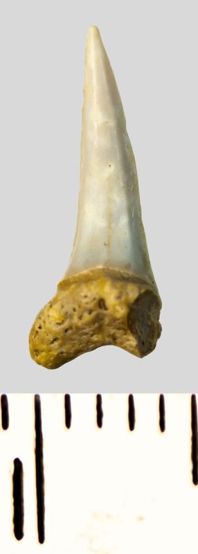 Зуб. Акула. Eostriatolamia subulata (Agassiz, 1843). Классификация: Хордовые Chordata, Позвоночные Vertebrata, Хрящевые рыбы Chondrichthyes, Пластиножаберные Elasmobranchii, Акулы Selachii, Ламнообразные Lamniformes, Песчаные акулы Odontaspididae