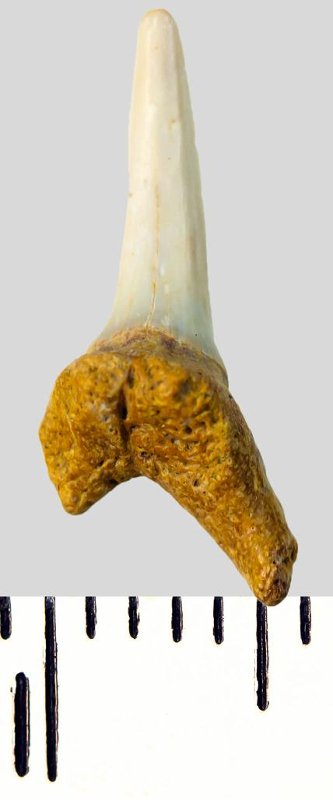 Зуб. Акула. Eostriatolamia subulata (Agassiz, 1843). Классификация: Хордовые Chordata, Позвоночные Vertebrata, Хрящевые рыбы Chondrichthyes, Пластиножаберные Elasmobranchii, Акулы Selachii, Ламнообразные Lamniformes, Песчаные акулы Odontaspididae