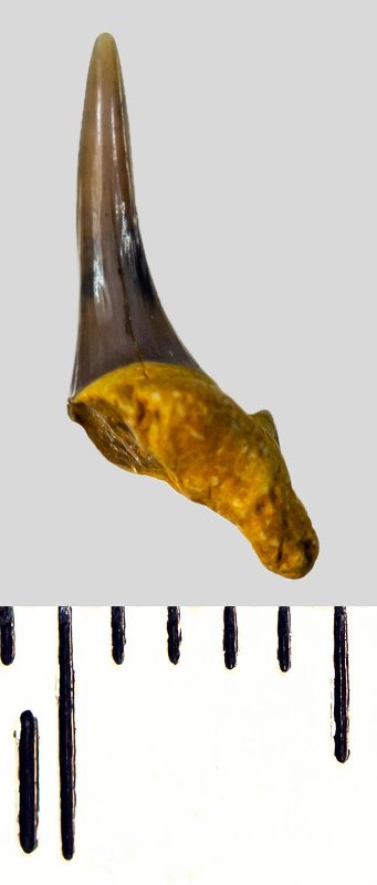 Зуб. Акула. Eostriatolamia subulata (Agassiz, 1843). Классификация: Хордовые Chordata, Позвоночные Vertebrata, Хрящевые рыбы Chondrichthyes, Пластиножаберные Elasmobranchii, Акулы Selachii, Ламнообразные Lamniformes, Песчаные акулы Odontaspididae