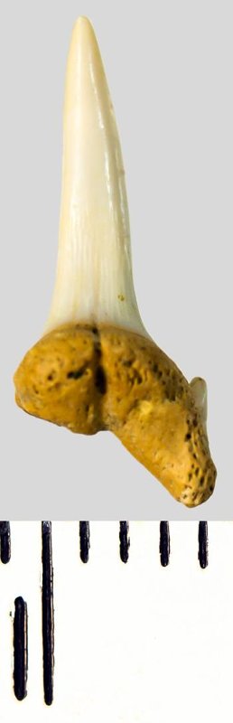 Зуб. Акула. Eostriatolamia subulata (Agassiz, 1843). Классификация: Хордовые Chordata, Позвоночные Vertebrata, Хрящевые рыбы Chondrichthyes, Пластиножаберные Elasmobranchii, Акулы Selachii, Ламнообразные Lamniformes, Песчаные акулы Odontaspididae