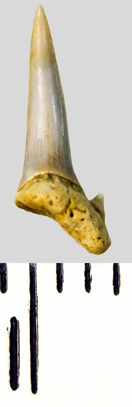 Зуб. Акула. Eostriatolamia subulata (Agassiz, 1843). Классификация: Хордовые Chordata, Позвоночные Vertebrata, Хрящевые рыбы Chondrichthyes, Пластиножаберные Elasmobranchii, Акулы Selachii, Ламнообразные Lamniformes, Песчаные акулы Odontaspididae
