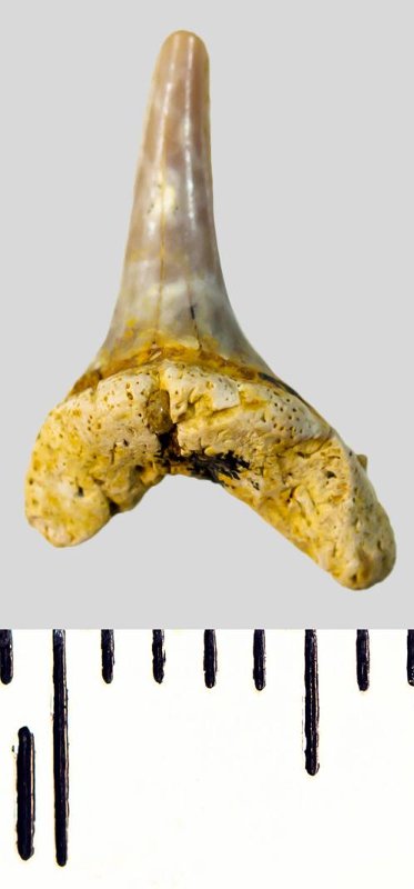 Зуб. Акула. Eostriatolamia subulata (Agassiz, 1843). Классификация: Хордовые Chordata, Позвоночные Vertebrata, Хрящевые рыбы Chondrichthyes, Пластиножаберные Elasmobranchii, Акулы Selachii, Ламнообразные Lamniformes, Песчаные акулы Odontaspididae
