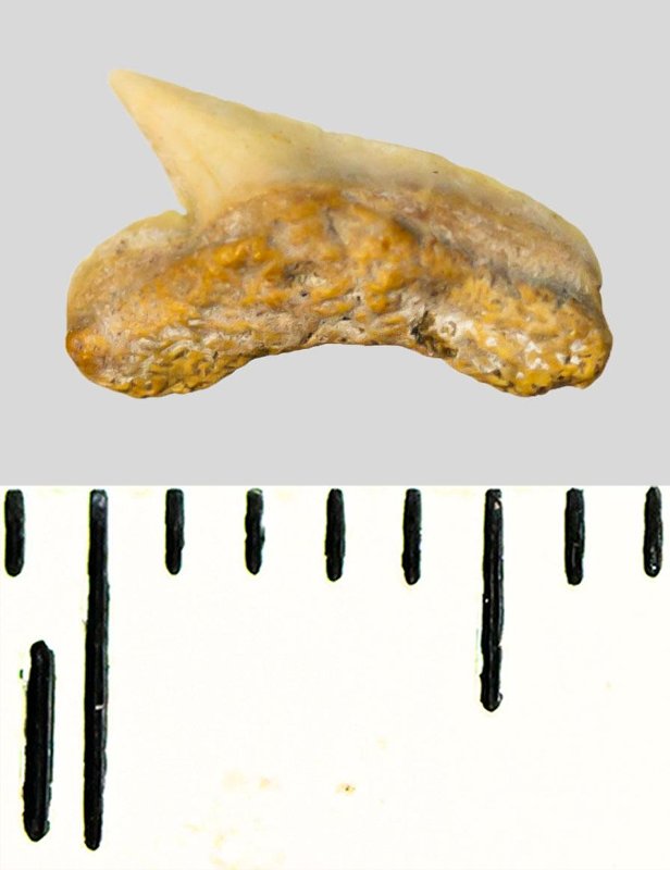 Зуб. Акула. Palaeoanacorax volgensis Glickman, 1971. Классификация: Хордовые Chordata, Позвоночные Vertebrata, Хрящевые рыбы Chondrichthyes, Пластиножаберные Elasmobranchii, Акулы Selachii, Ламнообразные Lamniformes, Anacoracidae