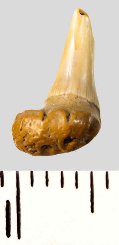 Зуб (фрагмент). Акула. Paraorthacodus recurvus (Trautschold, 1877). Классификация: Хордовые Chordata, Позвоночные Vertebrata, Хрящевые рыбы Chondrichthyes, Пластиножаберные Elasmobranchii, Акулы Selachii, Многожаберникообразные Hexanchiformes, Параортакодонты Paraorthacodontidae