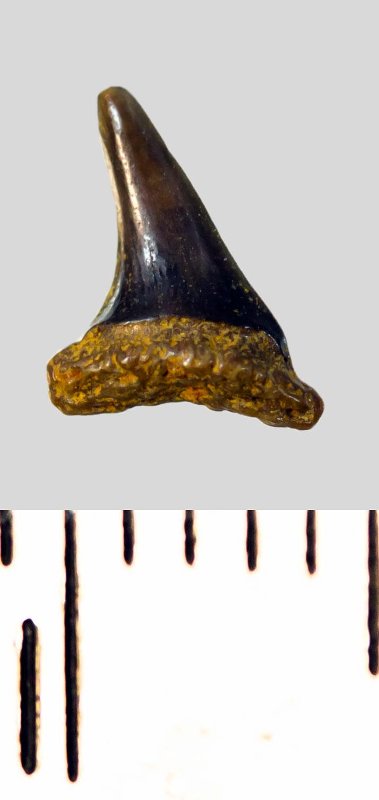 Зуб. Акула. Eostriatolamia subulata (Agassiz, 1843). Классификация: Хордовые Chordata, Позвоночные Vertebrata, Хрящевые рыбы Chondrichthyes, Пластиножаберные Elasmobranchii, Акулы Selachii, Ламнообразные Lamniformes, Песчаные акулы Odontaspididae
