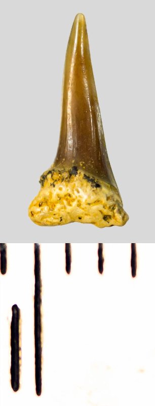 Зуб. Акула. Eostriatolamia subulata (Agassiz, 1843). Классификация: Хордовые Chordata, Позвоночные Vertebrata, Хрящевые рыбы Chondrichthyes, Пластиножаберные Elasmobranchii, Акулы Selachii, Ламнообразные Lamniformes, Песчаные акулы Odontaspididae