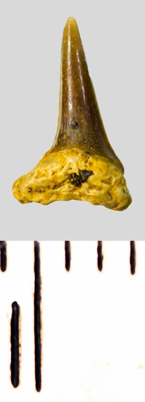 Зуб. Акула. Eostriatolamia subulata (Agassiz, 1843). Классификация: Хордовые Chordata, Позвоночные Vertebrata, Хрящевые рыбы Chondrichthyes, Пластиножаберные Elasmobranchii, Акулы Selachii, Ламнообразные Lamniformes, Песчаные акулы Odontaspididae