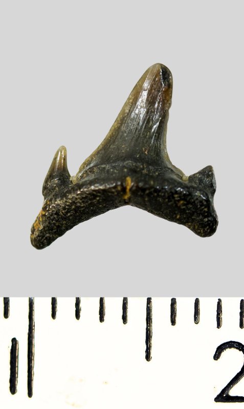 Мелкий боковой зуб с коронкой серого цвета, колюще-режущего типа, S-образно изогнутой, с гладким режущим краем. С лингвальной стороны у основания коронки на эмали имеется скульптура в виде слабой продольной струйчатости. Корень охристый, арочный, умеренно массивный, со следами окатанности. С лингвальной стороны корня одна питательная борозда. Присутствует одна пара добавочных зубцов коронки.