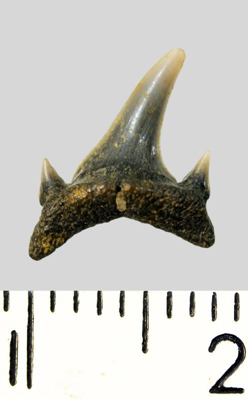 Мелкий боковой зуб с коронкой серого цвета, колюще-режущего типа, S-образно изогнутой, с гладким режущим краем. С лингвальной стороны у основания коронки на эмали имеется скульптура в виде слабой продольной струйчатости. Корень охристый, арочный, умеренно массивный, со следами окатанности. С лингвальной стороны корня одна питательная борозда. Присутствует одна пара добавочных зубцов коронки.