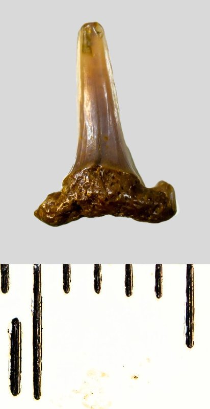 Зуб (фрагмент). Акула. Eostriatolamia subulata (Agassiz, 1843). Классификация: Хордовые Chordata, Позвоночные Vertebrata, Хрящевые рыбы Chondrichthyes, Пластиножаберные Elasmobranchii, Акулы Selachii, Ламнообразные Lamniformes, Песчаные акулы Odontaspididae