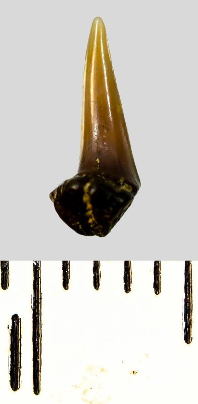 Зуб (фрагмент). Акула. Eostriatolamia subulata (Agassiz, 1843). Классификация: Хордовые Chordata, Позвоночные Vertebrata, Хрящевые рыбы Chondrichthyes, Пластиножаберные Elasmobranchii, Акулы Selachii, Ламнообразные Lamniformes, Песчаные акулы Odontaspididae