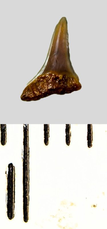 Зуб (фрагмент). Акула. Eostriatolamia subulata (Agassiz, 1843). Классификация: Хордовые Chordata, Позвоночные Vertebrata, Хрящевые рыбы Chondrichthyes, Пластиножаберные Elasmobranchii, Акулы Selachii, Ламнообразные Lamniformes, Песчаные акулы Odontaspididae
