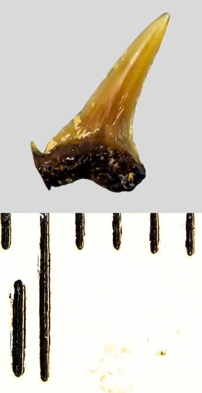 Зуб (фрагмент). Акула. Eostriatolamia subulata (Agassiz, 1843). Классификация: Хордовые Chordata, Позвоночные Vertebrata, Хрящевые рыбы Chondrichthyes, Пластиножаберные Elasmobranchii, Акулы Selachii, Ламнообразные Lamniformes, Песчаные акулы Odontaspididae