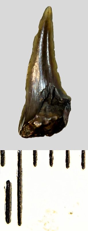 Зуб (фрагмент). Акула. Eostriatolamia subulata (Agassiz, 1843). Классификация: Хордовые Chordata, Позвоночные Vertebrata, Хрящевые рыбы Chondrichthyes, Пластиножаберные Elasmobranchii, Акулы Selachii, Ламнообразные Lamniformes, Песчаные акулы Odontaspididae