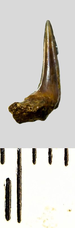 Зуб (фрагмент). Акула. Eostriatolamia subulata (Agassiz, 1843). Классификация: Хордовые Chordata, Позвоночные Vertebrata, Хрящевые рыбы Chondrichthyes, Пластиножаберные Elasmobranchii, Акулы Selachii, Ламнообразные Lamniformes, Песчаные акулы Odontaspididae