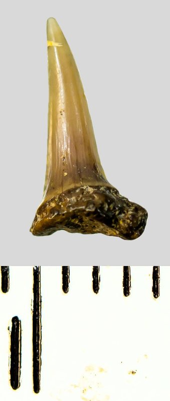 Зуб (фрагмент). Акула. Eostriatolamia subulata (Agassiz, 1843). Классификация: Хордовые Chordata, Позвоночные Vertebrata, Хрящевые рыбы Chondrichthyes, Пластиножаберные Elasmobranchii, Акулы Selachii, Ламнообразные Lamniformes, Песчаные акулы Odontaspididae