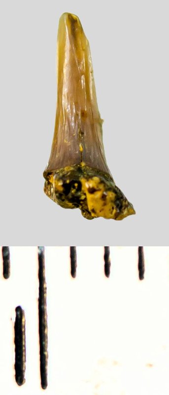 Зуб (фрагмент). Акула. Eostriatolamia subulata (Agassiz, 1843). Классификация: Хордовые Chordata, Позвоночные Vertebrata, Хрящевые рыбы Chondrichthyes, Пластиножаберные Elasmobranchii, Акулы Selachii, Ламнообразные Lamniformes, Песчаные акулы Odontaspididae