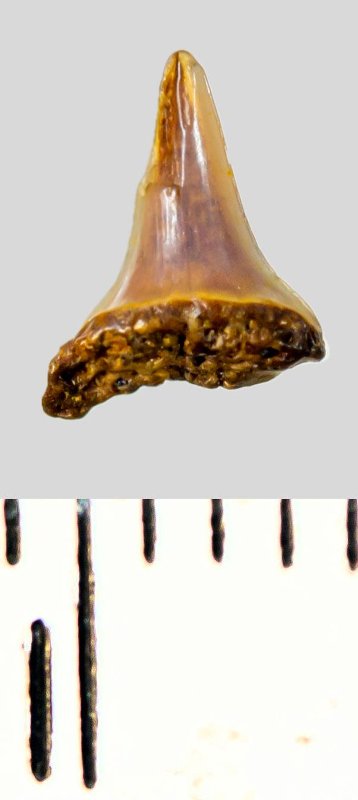 Зуб (фрагмент). Акула. Eostriatolamia subulata (Agassiz, 1843). Классификация: Хордовые Chordata, Позвоночные Vertebrata, Хрящевые рыбы Chondrichthyes, Пластиножаберные Elasmobranchii, Акулы Selachii, Ламнообразные Lamniformes, Песчаные акулы Odontaspididae
