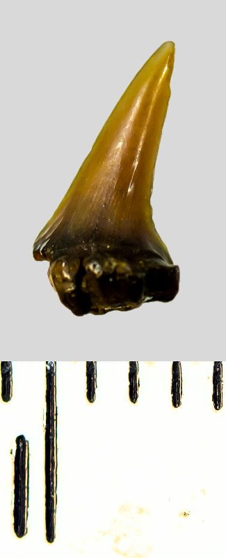 Зуб (фрагмент). Акула. Eostriatolamia subulata (Agassiz, 1843). Классификация: Хордовые Chordata, Позвоночные Vertebrata, Хрящевые рыбы Chondrichthyes, Пластиножаберные Elasmobranchii, Акулы Selachii, Ламнообразные Lamniformes, Песчаные акулы Odontaspididae