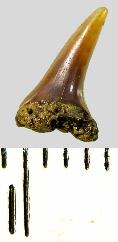 Зуб (фрагмент). Акула. Eostriatolamia subulata (Agassiz, 1843). Классификация: Хордовые Chordata, Позвоночные Vertebrata, Хрящевые рыбы Chondrichthyes, Пластиножаберные Elasmobranchii, Акулы Selachii, Ламнообразные Lamniformes, Песчаные акулы Odontaspididae