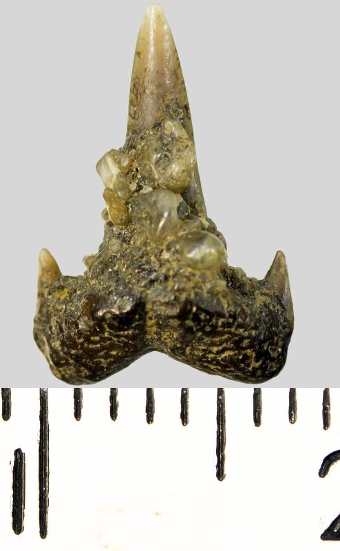 Мелкий боковой зуб с коронкой серого цвета, колюще-режущего типа, S-образно изогнутой, с гладким режущим краем. С лингвальной стороны у основания коронки на эмали имеется скульптура в виде слабой продольной струйчатости. Корень охристый, арочный, умеренно массивный, со следами окатанности. С лингвальной стороны корня одна питательная борозда. Присутствует одна пара добавочных зубцов коронки.