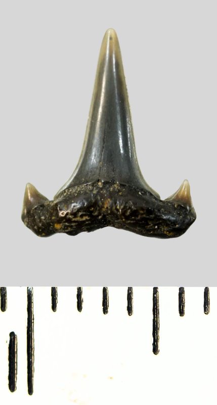 Мелкий боковой зуб с коронкой серого цвета, колюще-режущего типа, S-образно изогнутой, с гладким режущим краем. С лингвальной стороны у основания коронки на эмали имеется скульптура в виде слабой продольной струйчатости. Корень охристый, арочный, умеренно массивный, со следами окатанности. С лингвальной стороны корня одна питательная борозда. Присутствует одна пара добавочных зубцов коронки.