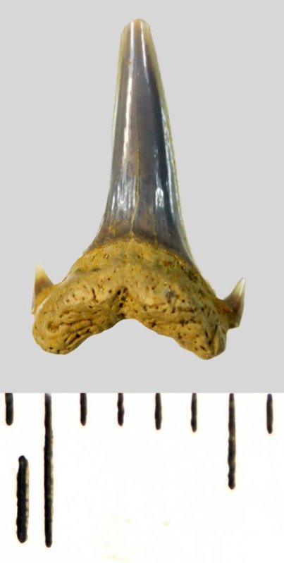 Мелкий боковой зуб с коронкой серого цвета, колюще-режущего типа, S-образно изогнутой, с гладким режущим краем. С лингвальной стороны у основания коронки на эмали имеется скульптура в виде слабой продольной струйчатости. Корень охристый, арочный, умеренно массивный, со следами окатанности. С лингвальной стороны корня одна питательная борозда. Присутствует одна пара добавочных зубцов коронки.