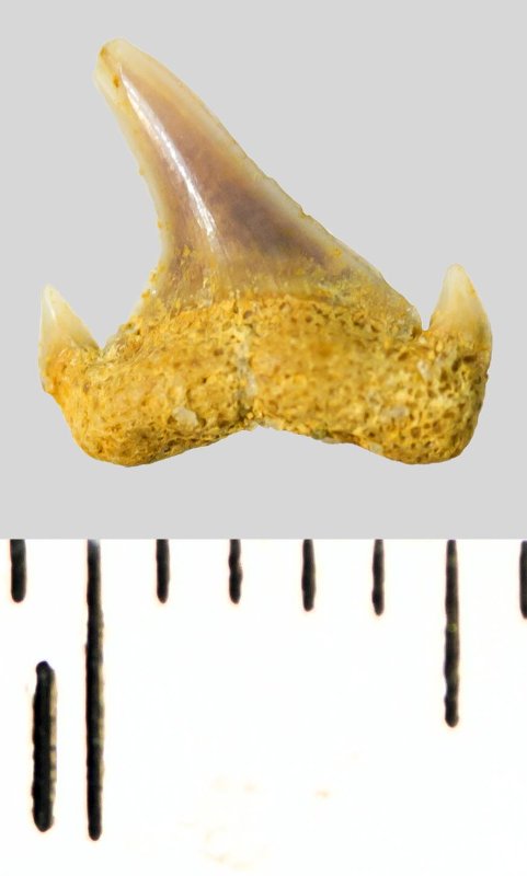 Мелкий боковой зуб с коронкой серого цвета, колюще-режущего типа, S-образно изогнутой, с гладким режущим краем. С лингвальной стороны у основания коронки на эмали имеется скульптура в виде слабой продольной струйчатости. Корень охристый, арочный, умеренно массивный, со следами окатанности. С лингвальной стороны корня одна питательная борозда. Присутствует одна пара добавочных зубцов коронки.