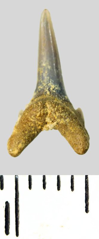Мелкий боковой зуб с коронкой серого цвета, колюще-режущего типа, S-образно изогнутой, с гладким режущим краем. С лингвальной стороны у основания коронки на эмали имеется скульптура в виде слабой продольной струйчатости. Корень охристый, арочный, умеренно массивный, со следами окатанности. С лингвальной стороны корня одна питательная борозда. Присутствует одна пара добавочных зубцов коронки.
