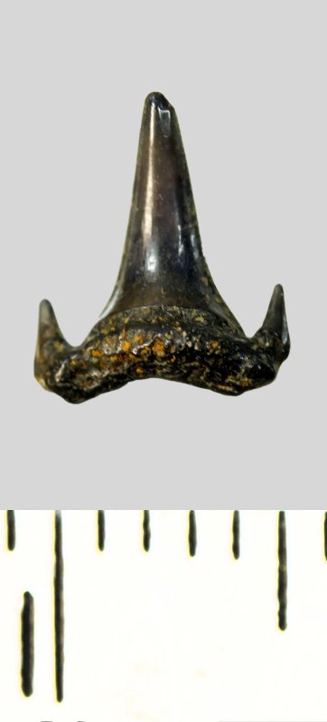 Мелкий боковой зуб с коронкой серого цвета, колюще-режущего типа, S-образно изогнутой, с гладким режущим краем. С лингвальной стороны у основания коронки на эмали имеется скульптура в виде слабой продольной струйчатости. Корень охристый, арочный, умеренно массивный, со следами окатанности. С лингвальной стороны корня одна питательная борозда. Присутствует одна пара добавочных зубцов коронки.