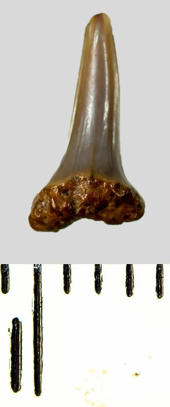 Зуб. Акула. Eostriatolamia subulata (Agassiz, 1843). Классификация: Хордовые Chordata, Позвоночные Vertebrata, Хрящевые рыбы Chondrichthyes, Пластиножаберные Elasmobranchii, Акулы Selachii, Ламнообразные Lamniformes, Песчаные акулы Odontaspididae