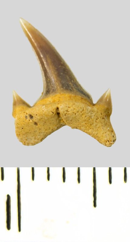 Мелкий боковой зуб с коронкой серого цвета, колюще-режущего типа, S-образно изогнутой, с гладким режущим краем. С лингвальной стороны у основания коронки на эмали имеется скульптура в виде слабой продольной струйчатости. Корень охристый, арочный, умеренно массивный, со следами окатанности. С лингвальной стороны корня одна питательная борозда. Присутствует одна пара добавочных зубцов коронки.