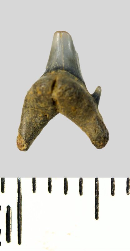 Мелкий боковой зуб с коронкой серого цвета, колюще-режущего типа, S-образно изогнутой, с гладким режущим краем. С лингвальной стороны у основания коронки на эмали имеется скульптура в виде слабой продольной струйчатости. Корень охристый, арочный, умеренно массивный, со следами окатанности. С лингвальной стороны корня одна питательная борозда. Присутствует одна пара добавочных зубцов коронки.