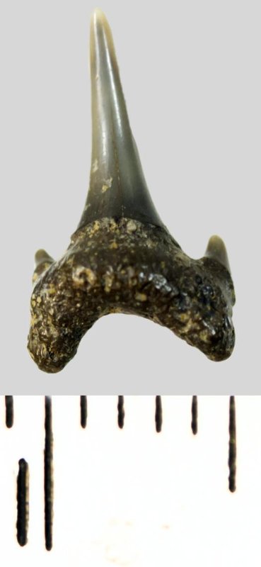 Мелкий боковой зуб с коронкой серого цвета, колюще-режущего типа, S-образно изогнутой, с гладким режущим краем. С лингвальной стороны у основания коронки на эмали имеется скульптура в виде слабой продольной струйчатости. Корень охристый, арочный, умеренно массивный, со следами окатанности. С лингвальной стороны корня одна питательная борозда. Присутствует одна пара добавочных зубцов коронки.