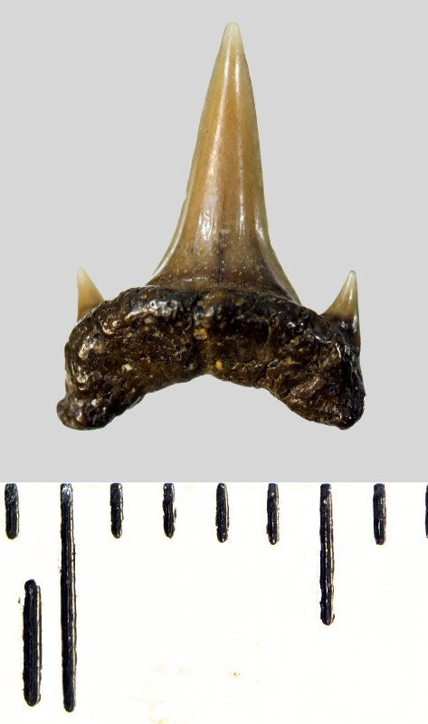 Мелкий боковой зуб с коронкой серого цвета, колюще-режущего типа, S-образно изогнутой, с гладким режущим краем. С лингвальной стороны у основания коронки на эмали имеется скульптура в виде слабой продольной струйчатости. Корень охристый, арочный, умеренно массивный, со следами окатанности. С лингвальной стороны корня одна питательная борозда. Присутствует одна пара добавочных зубцов коронки.