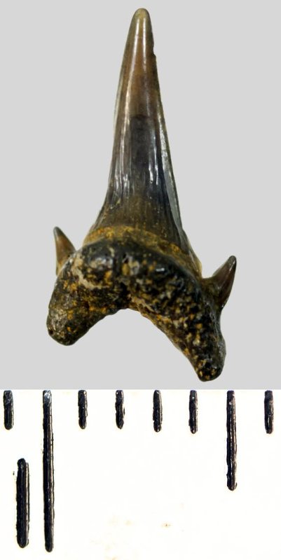 Мелкий боковой зуб с коронкой серого цвета, колюще-режущего типа, S-образно изогнутой, с гладким режущим краем. С лингвальной стороны у основания коронки на эмали имеется скульптура в виде слабой продольной струйчатости. Корень охристый, арочный, умеренно массивный, со следами окатанности. С лингвальной стороны корня одна питательная борозда. Присутствует одна пара добавочных зубцов коронки.