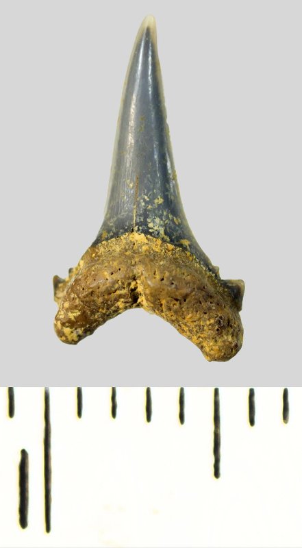 Мелкий боковой зуб с коронкой серого цвета, колюще-режущего типа, S-образно изогнутой, с гладким режущим краем. С лингвальной стороны у основания коронки на эмали имеется скульптура в виде слабой продольной струйчатости. Корень охристый, арочный, умеренно массивный, со следами окатанности. С лингвальной стороны корня одна питательная борозда. Присутствует одна пара добавочных зубцов коронки.