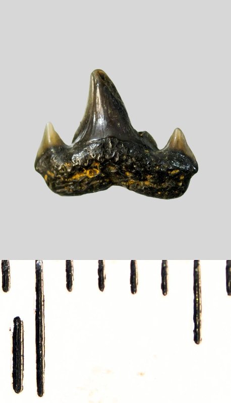 Мелкий боковой зуб с коронкой серого цвета, колюще-режущего типа, S-образно изогнутой, с гладким режущим краем. С лингвальной стороны у основания коронки на эмали имеется скульптура в виде слабой продольной струйчатости. Корень охристый, арочный, умеренно массивный, со следами окатанности. С лингвальной стороны корня одна питательная борозда. Присутствует одна пара добавочных зубцов коронки.