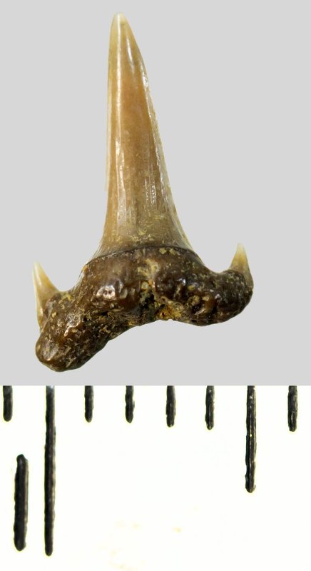 Мелкий боковой зуб с коронкой серого цвета, колюще-режущего типа, S-образно изогнутой, с гладким режущим краем. С лингвальной стороны у основания коронки на эмали имеется скульптура в виде слабой продольной струйчатости. Корень охристый, арочный, умеренно массивный, со следами окатанности. С лингвальной стороны корня одна питательная борозда. Присутствует одна пара добавочных зубцов коронки.