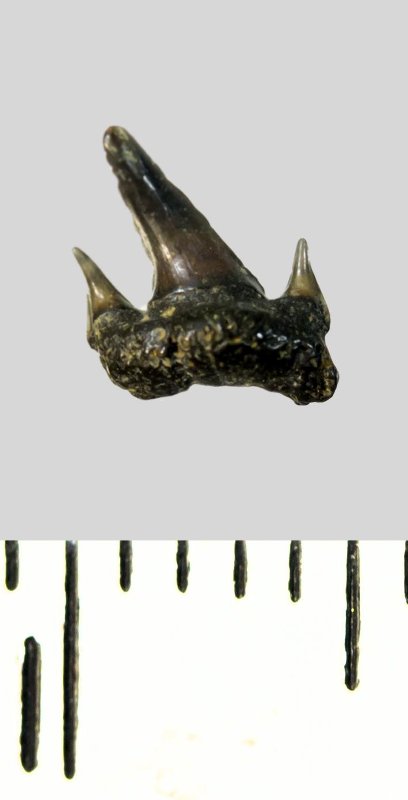 Мелкий боковой зуб с коронкой серого цвета, колюще-режущего типа, S-образно изогнутой, с гладким режущим краем. С лингвальной стороны у основания коронки на эмали имеется скульптура в виде слабой продольной струйчатости. Корень охристый, арочный, умеренно массивный, со следами окатанности. С лингвальной стороны корня одна питательная борозда. Присутствует одна пара добавочных зубцов коронки.