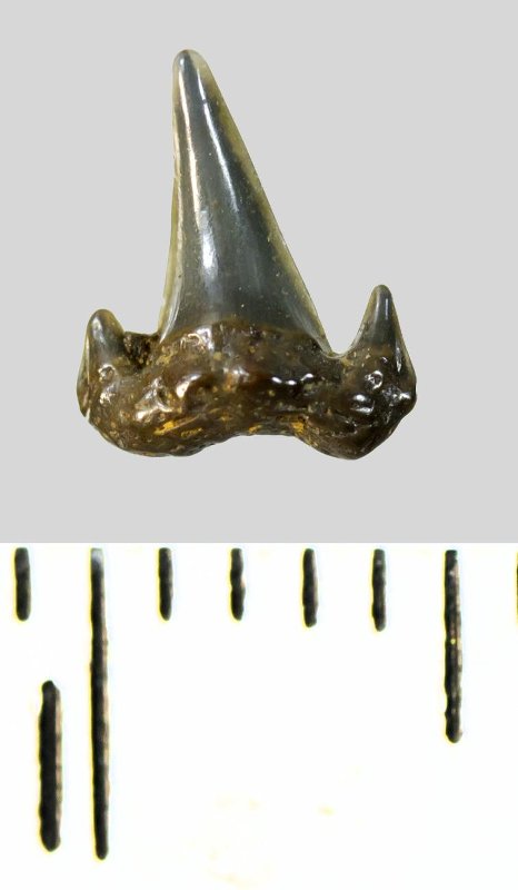 Мелкий боковой зуб с коронкой серого цвета, колюще-режущего типа, S-образно изогнутой, с гладким режущим краем. С лингвальной стороны у основания коронки на эмали имеется скульптура в виде слабой продольной струйчатости. Корень охристый, арочный, умеренно массивный, со следами окатанности. С лингвальной стороны корня одна питательная борозда. Присутствует одна пара добавочных зубцов коронки.
