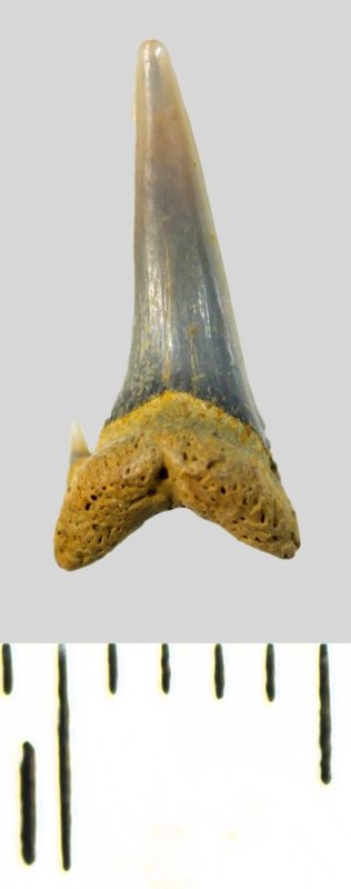 Мелкий боковой зуб с коронкой серого цвета, колюще-режущего типа, S-образно изогнутой, с гладким режущим краем. С лингвальной стороны у основания коронки на эмали имеется скульптура в виде слабой продольной струйчатости. Корень охристый, арочный, умеренно массивный, со следами окатанности. Имеется одна питательная борозда с лингвальной стороны корня. Имелась одна пара добавочных зубцов коронки, сохранился только левый.