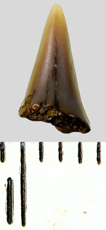 Зуб (фрагмент). Акула. Eostriatolamia subulata (Agassiz, 1843). Классификация: Хордовые Chordata, Позвоночные Vertebrata, Хрящевые рыбы Chondrichthyes, Пластиножаберные Elasmobranchii, Акулы Selachii, Ламнообразные Lamniformes, Песчаные акулы Odontaspididae