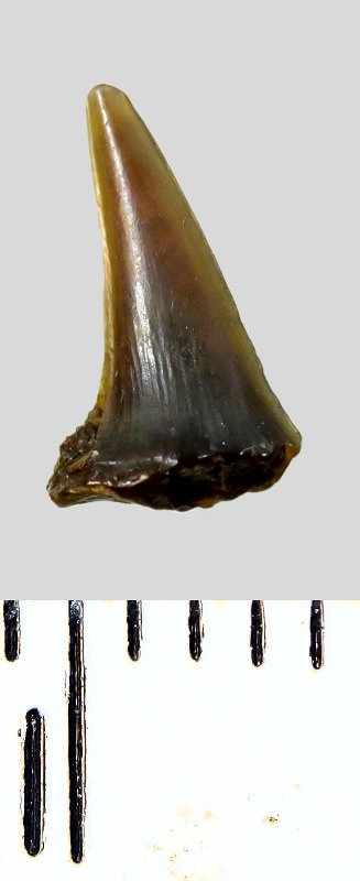 Зуб (фрагмент). Акула. Eostriatolamia subulata (Agassiz, 1843). Классификация: Хордовые Chordata, Позвоночные Vertebrata, Хрящевые рыбы Chondrichthyes, Пластиножаберные Elasmobranchii, Акулы Selachii, Ламнообразные Lamniformes, Песчаные акулы Odontaspididae