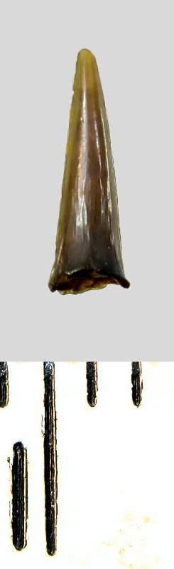 Зуб (фрагмент). Акула. Eostriatolamia subulata (Agassiz, 1843). Классификация: Хордовые Chordata, Позвоночные Vertebrata, Хрящевые рыбы Chondrichthyes, Пластиножаберные Elasmobranchii, Акулы Selachii, Ламнообразные Lamniformes, Песчаные акулы Odontaspididae